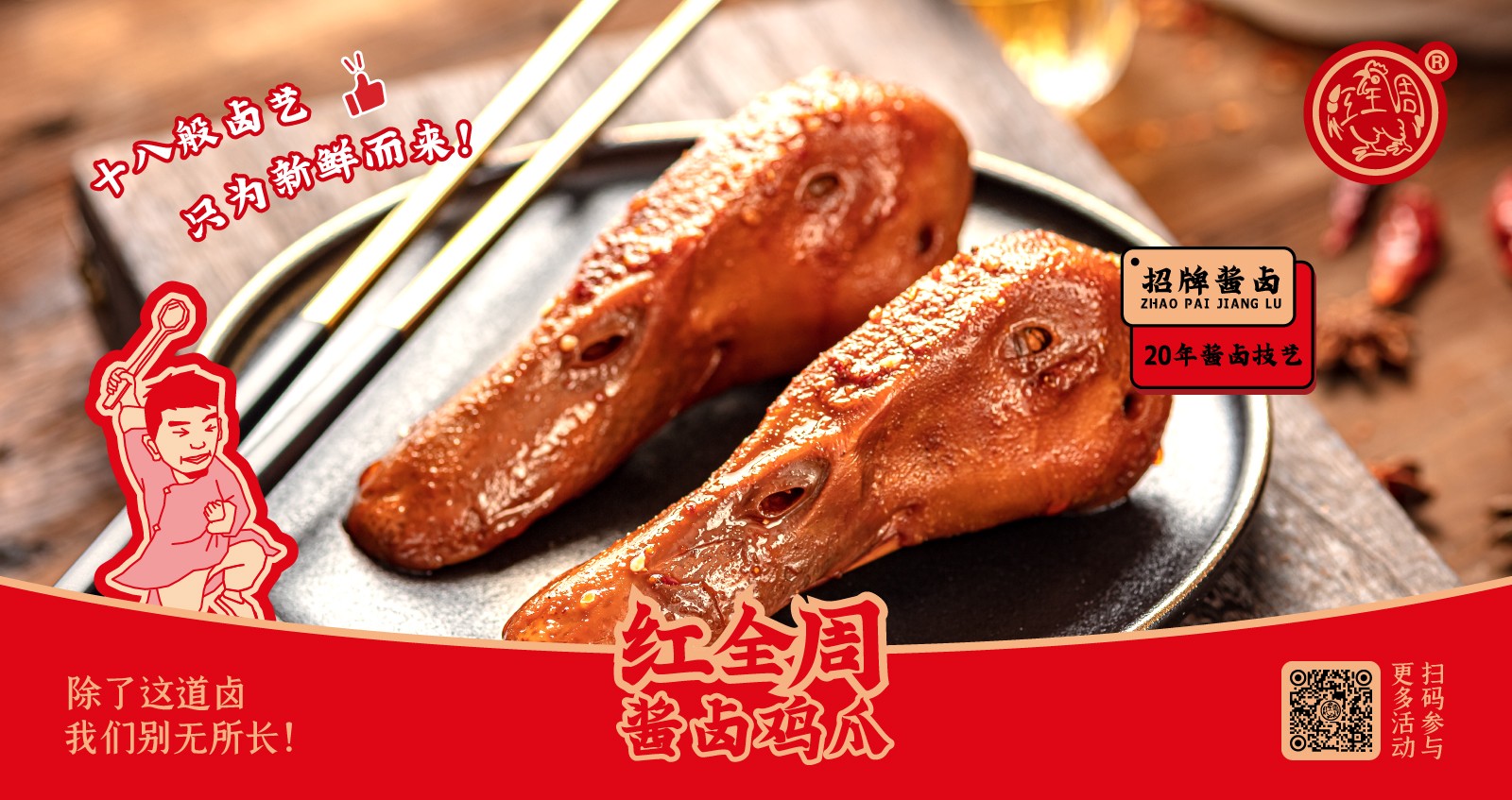 紅全周品牌創立于2012年,其生產總部坐落在以“紅全周雞爪”聞名的福建泉州市南安洪瀨鎮,經張福來師傅多年研制而成的獨家秘方,獨特的鹵制工藝,以“鮮、香、韌、辣”的特點,贏得廣大食客的交口稱贊。紅全周繼承中華美食傳統,堅持以“細微處見風范,毫厘間定乾坤”的服務準則,遵循現代健康飲食理念,精選上等食材,致力為消費者提供安全、健康的美食新體驗。